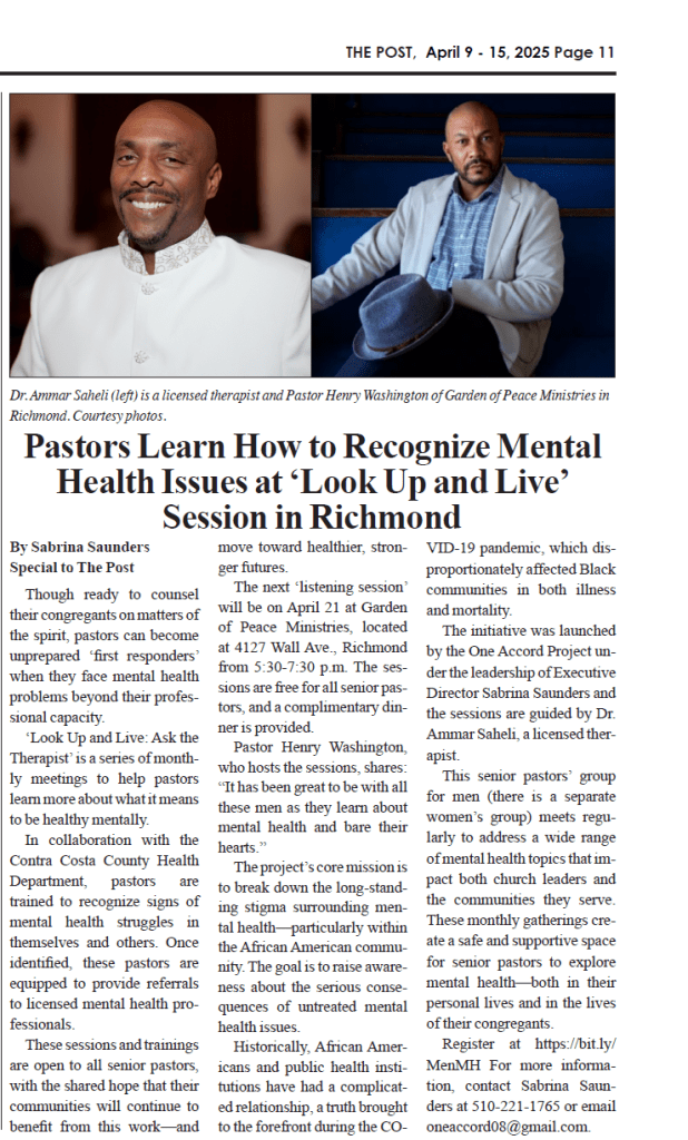 The One Accord Project leads a network of 30 African American pastors and faith-leaders from various congregations and denominations in Contra Costa County, California. This network consists of committed and engaged clergy who are committed to changing the narrative in their communities and congregations. The One Accord Project hosts monthly briefings with this network of, medical experts, county health officials and other subject matter experts. The briefings provide the network members with the opportunity to learn about the most current information on health issues impacting their communities such as COVID-19 as well as resources and strategies to address the issues, e.g., messaging, outreach events, etc. The One Accord project uses the monthly briefings to promote effective collaboration and engagement between the network members and medical experts, county officials, subject matter experts and community leaders.